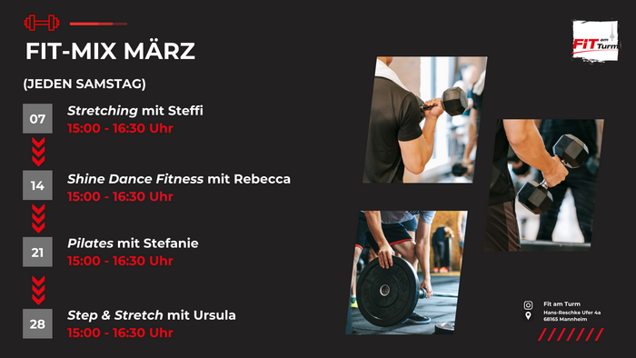 Auch im März erwartet euch beim FIT MIX ein abwechslungsreiches Programm aus Bewegung, Kräftigung und Mobilisation. Jeden Samstag bieten wir euch wechselnde Kurseinheiten mit unterschiedlichen Trainingsschwerpunkten. Von entspannendem Stretching über energiegeladenes Dance Fitness bis hin zu kräftigendem Pilates und funktionellen Workouts ist für alle etwas dabei.