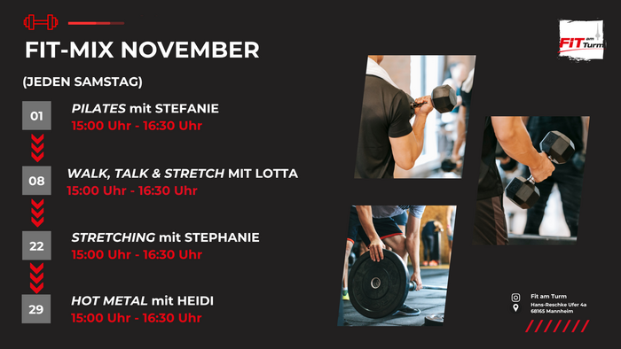 Abwechslung, Energie und Spaß – jeden Samstag erwartet dich ein neues Highlight! Unser FiT-MIX bietet dir die perfekte Gelegenheit, verschiedene Trainingsformate auszuprobieren und gemeinsam mit motivierten Trainer*innen ins Wochenende zu starten. Egal ob Power, Stretch oder funktionelles Training – sei dabei und bring frischen Schwung in deinen Samstag!